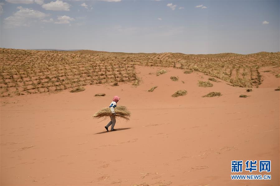 A worker walks in the desert, holding a bunch of straw. Photo from Xinhua