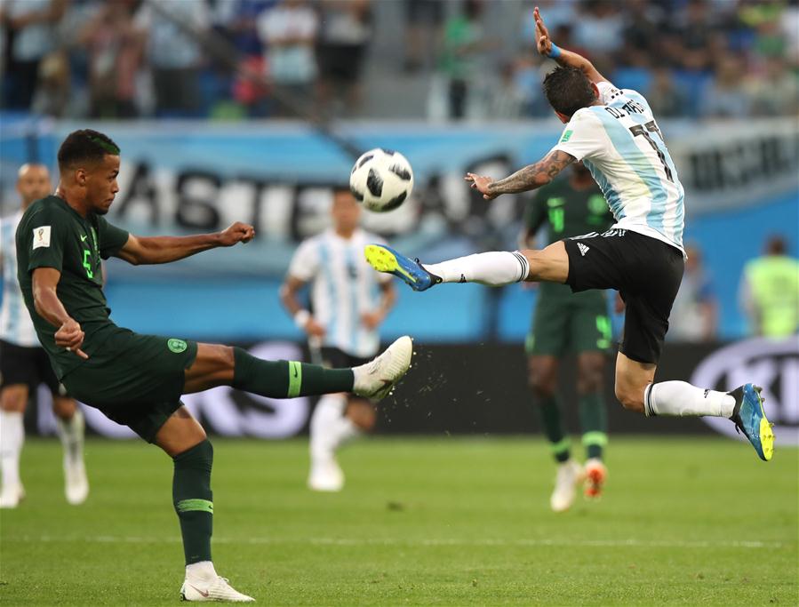 William Ekong (L) of Nigeria vies with Angel Di Maria of Argentina during the 2018 FIFA World Cup Group D match between Nigeria and Argentina in Saint Petersburg, Russia, June 26, 2018. (Xinhua/Wu Zhuang)