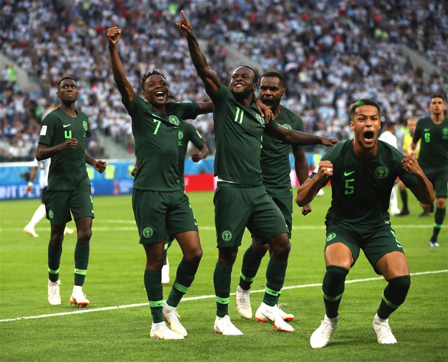 Victor Moses (C) of Nigeria celebrates scoring with teammates during the 2018 FIFA World Cup Group D match between Nigeria and Argentina in Saint Petersburg, Russia, June 26, 2018. Argentina won 2-1 and advanced to the round of 16. (Xinhua/Wu Zhuang)