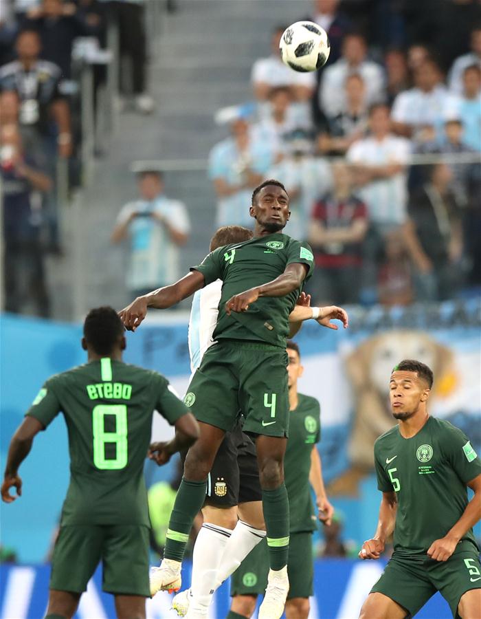 Wilfred Ndidi (top) of Nigeria competes for a header during the 2018 FIFA World Cup Group D match between Nigeria and Argentina in Saint Petersburg, Russia, June 26, 2018. (Xinhua/Wu Zhuang)
