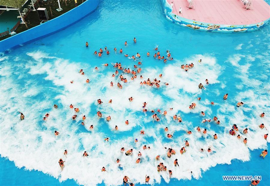 People cool off at a waterpark in Haizhou District of Lianyungang, east China's Jiangsu Province, July 2, 2018. (Xinhua/Geng Yuhe)