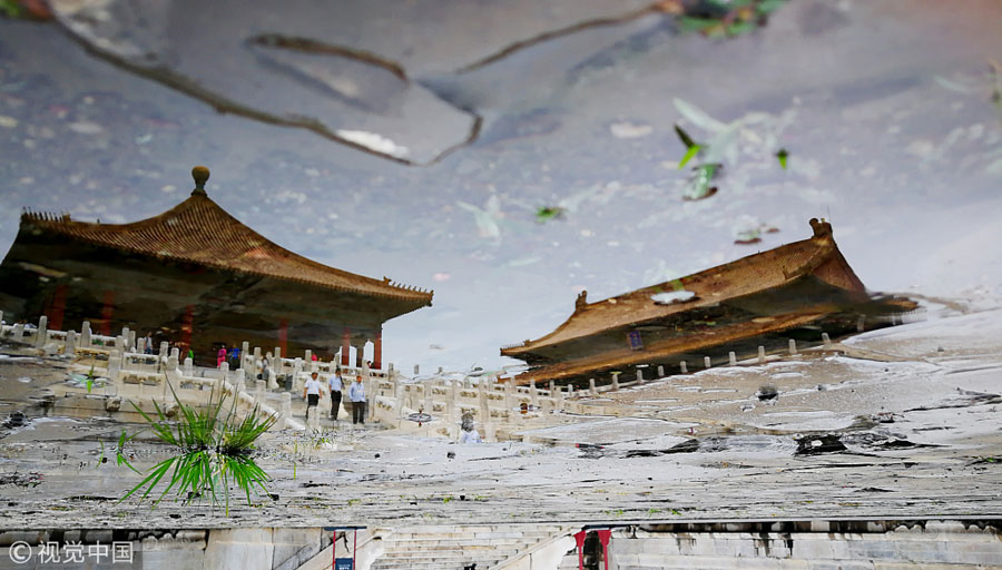 A mirror image of the Forbidden City is reflected on the water in Beijing on July 11, after a heavy rainfall. [Photo/VCG]