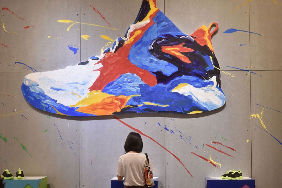A potential client studies Anta sneakers during an annual expo for the shoes and sports industry in Jinjiang, Fujian province on April 18, 2017. [Photo/Xinhua]