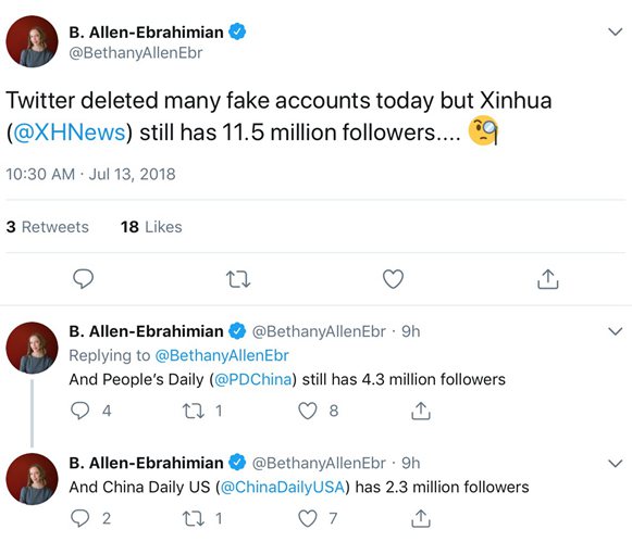 “Twitter deleted many fake accounts today but Xinhua still has 11.5 million followers, People’s Daily still has 4.3 million followers, and China Daily still has 2.3 million followers,” she said in a series of tweets.