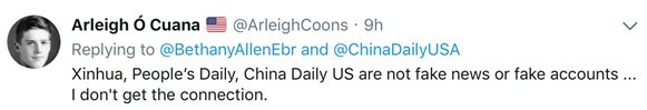 Xinhua, People’s Daily, and China Daily “are not fake news or fake accounts,” a Twitter user responded, adding: “I don’t get the connection.”
