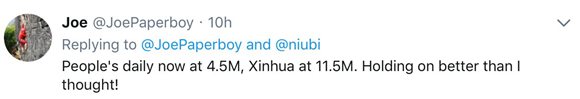 Others were surprised, too. Bill Bishop, who writes the Sinocism China Newsletter, wrote on Twitter that it “will be fun” to see how many followers China’s “propaganda organs” lose as a result of the purge. One user responded that People’s Daily and Xinhua are “holding on better than I thought!”