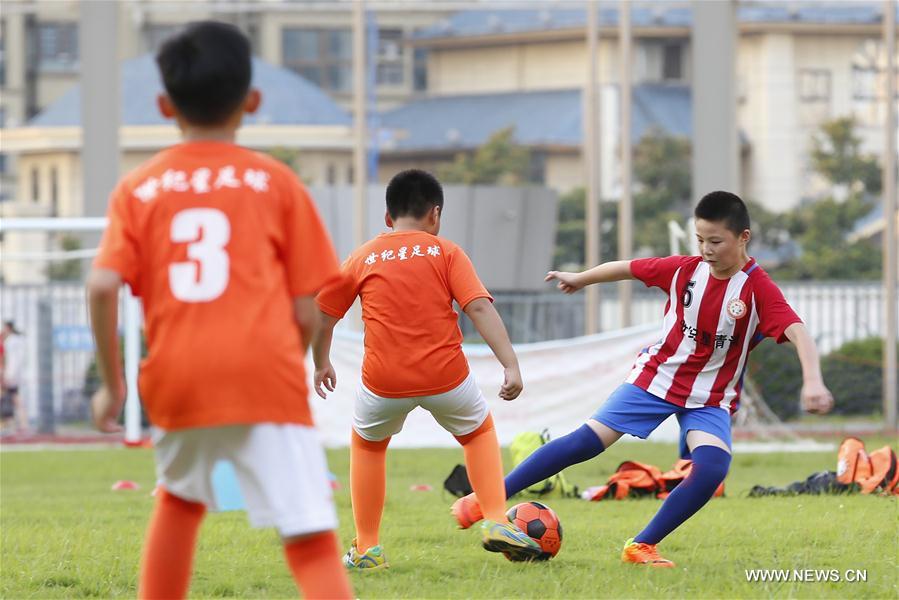 Students attend a football training in Xuyi County of Huai'an, east China's Jiangsu Province, July 18, 2018. Chinese students have entered their summer vacation, during which many of them chose to spend the vacation by developing their hobbies. (Xinhua/Yan Huaifeng)