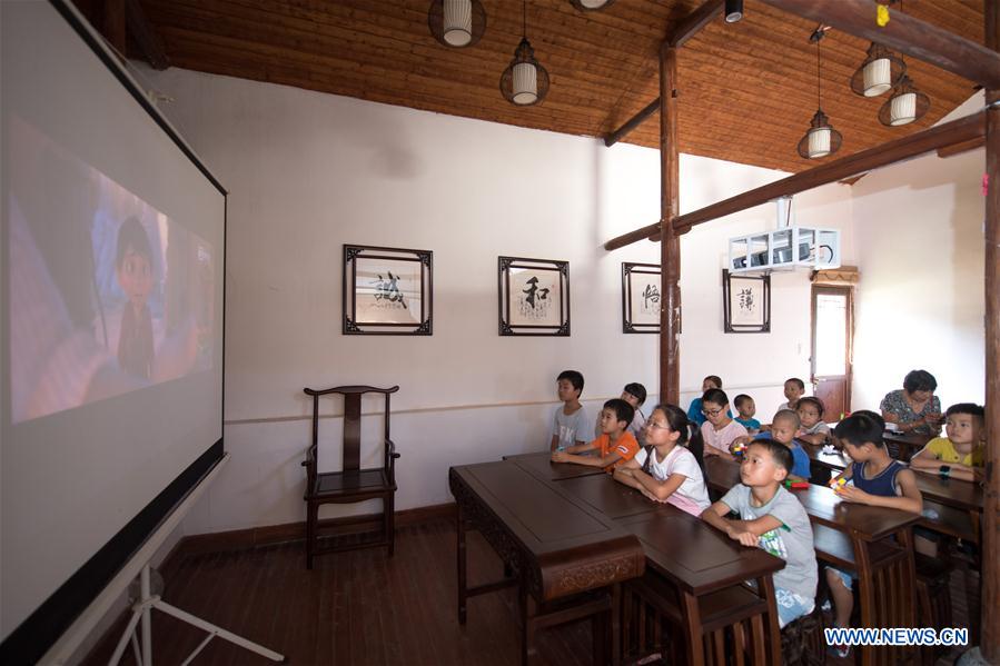 Primary school students watch a movie in a library in Deqing County, east China's Zhejiang Province, July 19, 2018. In recent years, the local government turned some spare old buildings into libraries featured with folk custom or ancient Chinese civilizations. (Xinhua/Weng Xinyang)