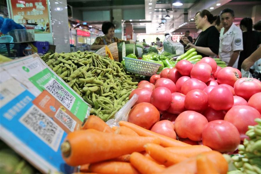 Citizens buy vegetable at a market in Nantong City, east China's Jiangsu Province, Aug. 9, 2018. China's consumer price index (CPI), a main gauge of inflation, rose 2.1 percent year on year in July, compared with 1.9 percent for June, data from the National Bureau of Statistics (NBS) showed Thursday. (Xinhua/Xu Congjun)