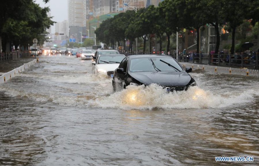 Cars run through the floodwater in Haikou, south China's Hainan Province, Aug. 10, 2018. Hainan was hit by heavy rainfalls under the influence of a tropical depression on Friday, which triggered a red alert for rainstorms in seven cities and counties, including Haikou. (Xinhua/Wang Junfeng)