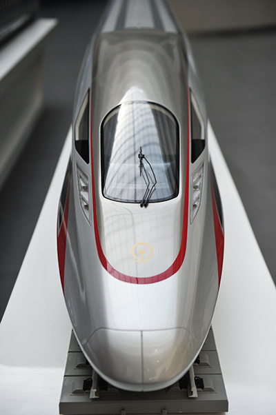 A model of a bullet train is displayed at CRRC Qingdao Sifang Co, a wholly owned subsidiary of China Railway Rolling Stock Corp. MAI TIAN/FOR CHINA DAILY