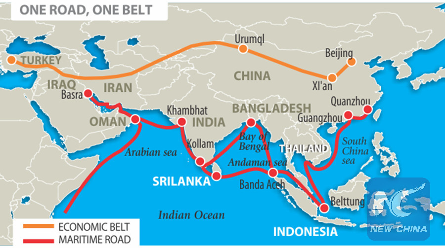 The picture presents key spots of China's Belt and Road initiative, which contains two business routes, the Silk Road Economic Belt and 21st-Century Maritime Silk Road. (Xinhua)