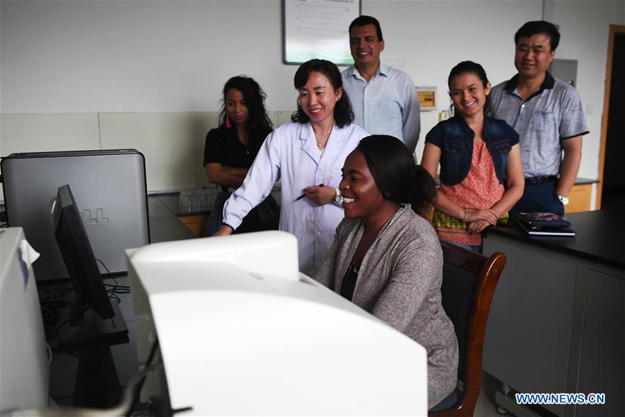 Nakanyala Elina Shekupe (front) learns technology on desertification combating at a lab in northwest China's Gansu Province, Aug. 27, 2018. Shekupe, 37, is an agricultural technology official from Namibia. She and 11 other students are taking part in a desertification combating and ecological restoration training course organized by China's Ministry of Commerce in Gansu. "I hope more and more African friends will come to China to learn new technology on desert control and benefit people in their hometown, " she said. (Xinhua/Chen Bin)