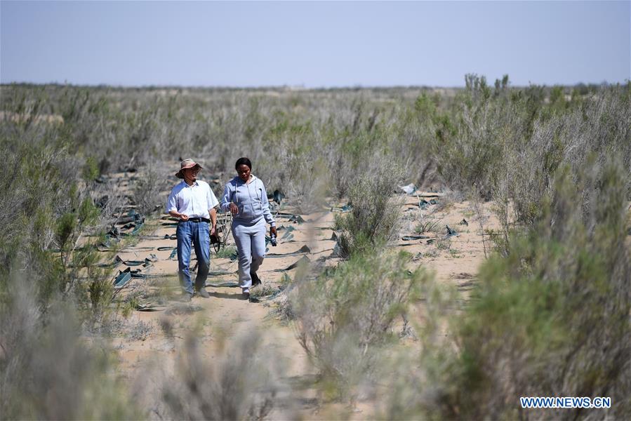 Nakanyala Elina Shekupe (R) and a staff member of Gansu Desert Control Research Institute visit a desertification combating demonstration zone in northwest China's Gansu Province, Aug. 25, 2018. Shekupe, 37, is an agricultural technology official from Namibia. She and 11 other students are taking part in a desertification combating and ecological restoration training course organized by China's Ministry of Commerce in Gansu. "I hope more and more African friends will come to China to learn new technology on desert control and benefit people in their hometown, " she said. (Xinhua/Chen Bin)