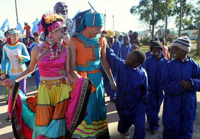 Members of China's Tianjin Performing Art Troupe take part in a parade with local children in Grahamstown, South Africa on July 9, 2011. [Photo/Xinhua]