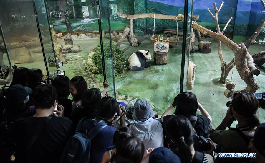 Photo taken on Aug. 30, 2018 shows giant panda Yuan Yuan at Taipei Zoo in Taipei, southeast China's Taiwan, Aug. 30, 2018. Born two days later than Yuan Yuan in 2004, giant panda Tuan Tuan also celebrated its 14th birthday together with Yuan Yuan on Thursday. Yuan Yuan and Tuan Tuan were given as a goodwill gift to Taiwan by the Chinese mainland. (Xinhua/Xue Yubin)