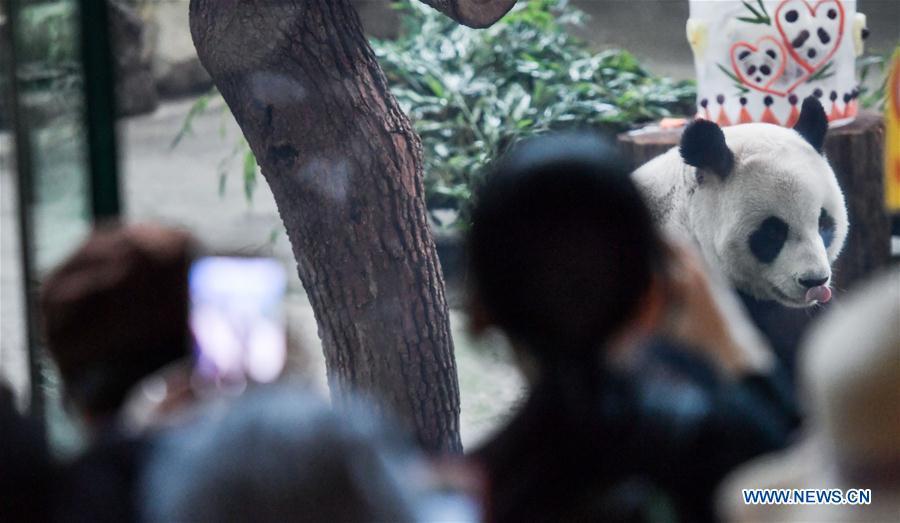 Photo taken on Aug. 30, 2018 shows giant panda Yuan Yuan at Taipei Zoo in Taipei, southeast China's Taiwan, Aug. 30, 2018. Born two days later than Yuan Yuan in 2004, giant panda Tuan Tuan also celebrated its 14th birthday together with Yuan Yuan on Thursday. Yuan Yuan and Tuan Tuan were given as a goodwill gift to Taiwan by the Chinese mainland. (Xinhua/Xue Yubin)