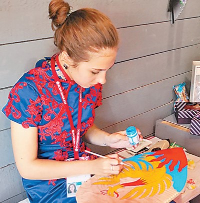 A woman in traditional Chinese costume paints at a shop in Vladivostok, Russia on Sept. 11, 2018. (Photo by Du Shangze from People’s Daily)