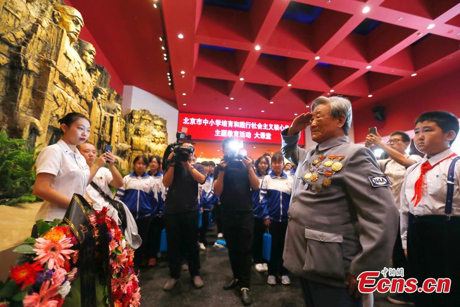 The 94-year-old New Fourth Army veteran Jiao Runkun salutes to martyrs at the Museum of the War of Chinese People's Resistance Against Japanese Aggression in Beijing, Sept. 18, 2018. On September 18, 1931, the Japanese Kwantung Army stationed in northeast China destroyed a section of the railway near Liutiaohu and then falsely accused the Chinese military of causing the explosion. Using this as a pretext, the Japanese then bombarded Shenyang and began invasion of northeast China. (Photo: China News Service/Fu Tian)
