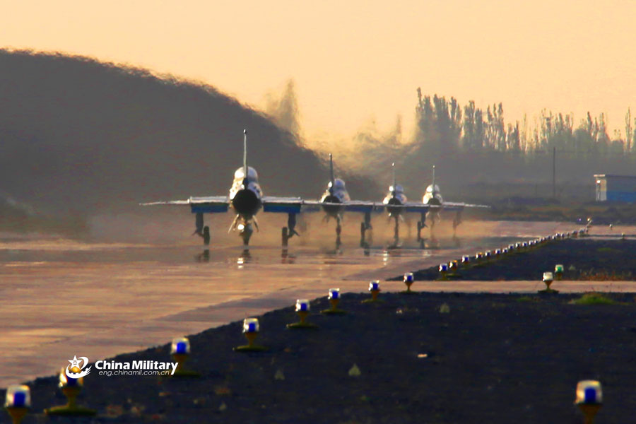 A group of J-7 fighter jets attached to a brigade with the PLA Air Force Xi'an Flight Academy taxi on the runway in formation during a flight training course near the Qilian Mountains in northwest China's Gansu Province on September 20, 2018. (eng.chinamil.com.cn/Photo by Cui Baoliang and Wang Shaofei)