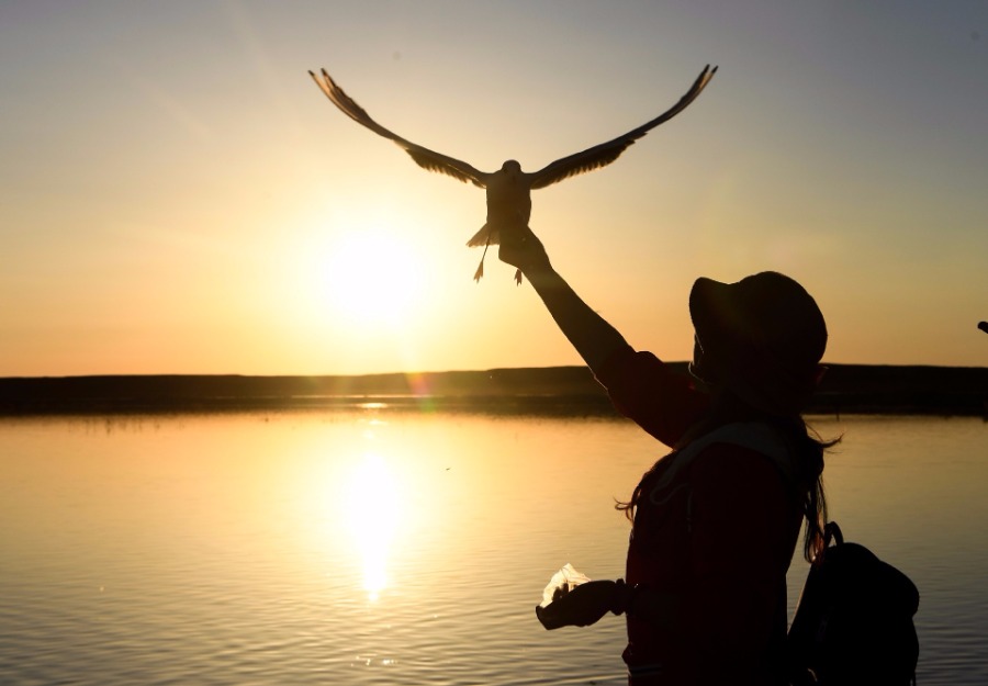 Photo taken on Oct 12, 2018 shows birds flying on the surface of Juyan Lake in Ejina Banner, North China's Inner Mongolia autonomous region.[Photo/Xinhua]