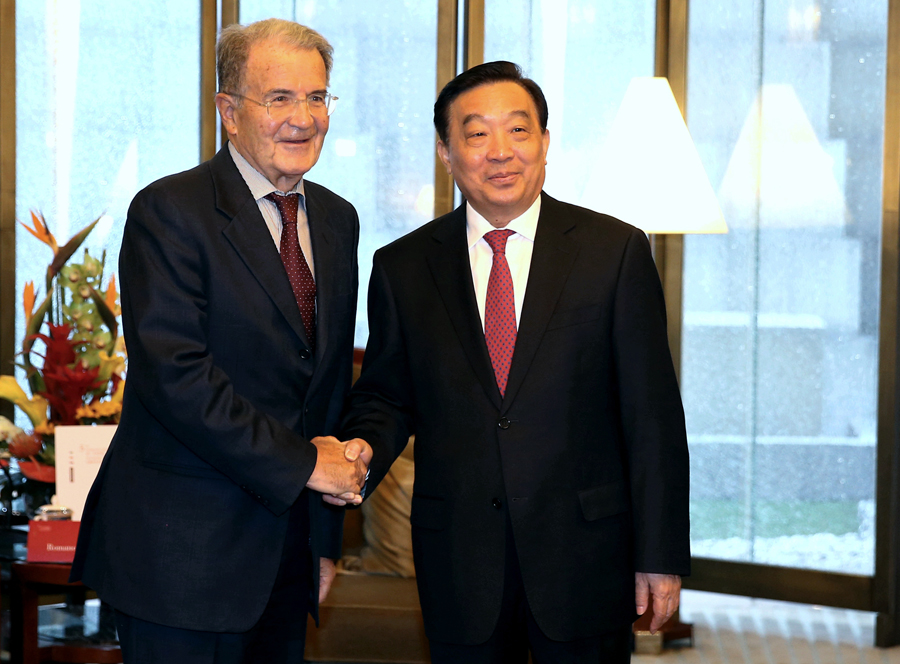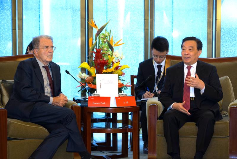 Vice-chairman of the Standing Committee of China’s National People’s Congress Wang Chen meets with former Italian prime minister Romano Prodi on the sidelines of the Taihu World Cultural Forum on Wednesday. [Photo/China Daily]