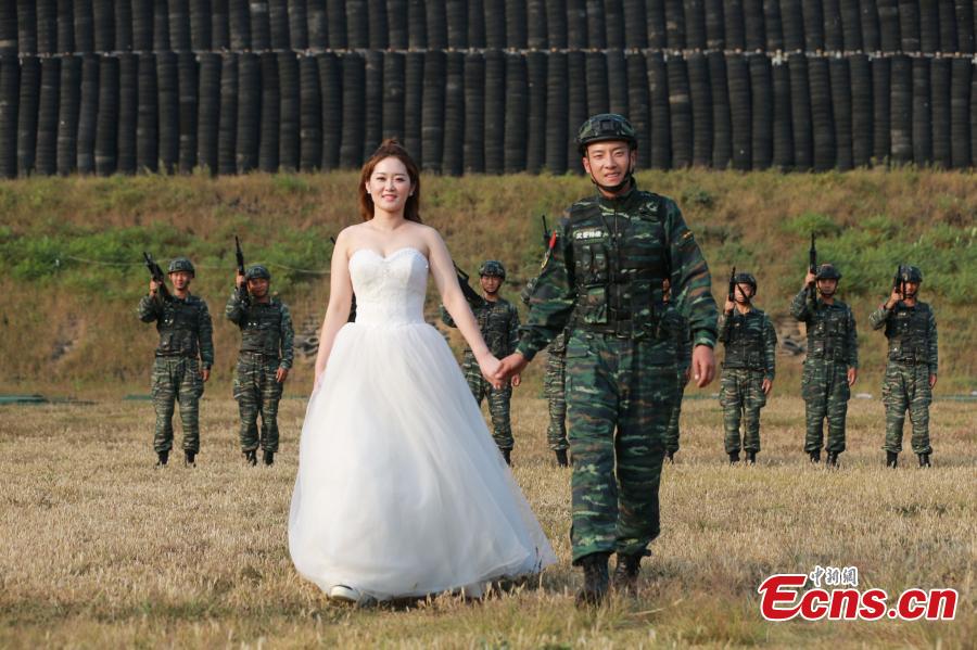 An armed police squad head in Yantai City, East China’s Shandong Province and his wife took special wedding photos at a barrack amid cheers and support of other members of the paramilitary police unit. (Photo: China News Service/Yang Lei)