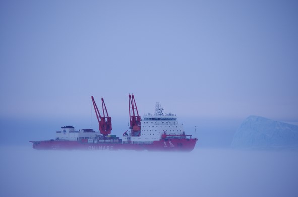 The research vessel Xuelong sails in the fog. (Photo from the official website of the State Oceanic Administration)