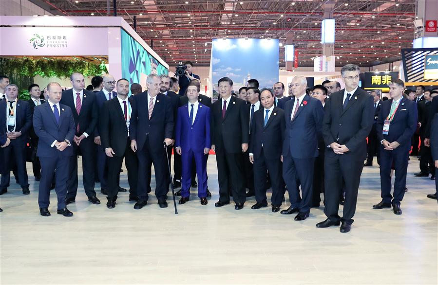 SHANGHAI, Nov. 5 (Xinhua) -- Chinese President Xi Jinping and foreign leaders who are attending the first China International Import Expo Monday toured around the Country Pavilion for Trade and Investment, which showcased development achievements and feature products from more than 80 countries.