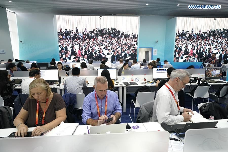 Journalists work at the media center of the first China International Import Expo (CIIE) in Shanghai, east China, Nov. 5, 2018. The first CIIE opened here on Monday and has drawn much attention from domestic and international media. (Xinhua/Shen Bohan)