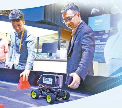 An employee of Dell demonstrates artificial intelligence autopilot technology. Photo by Bai Zhiyu from People’s Daily