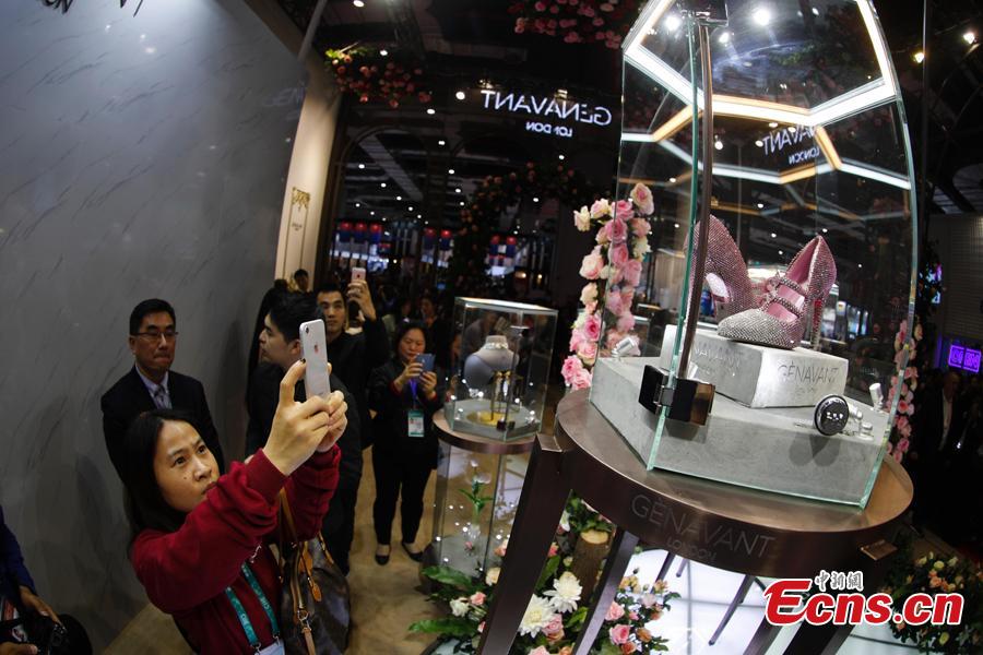 A pair of diamond shoes worth $4.35 million made their debut at China International Import Expo (CIIE) in Shanghai. They are designed and made by couture shoe designer Jimmy Choo. (Photo: China News Service/Du Yang)