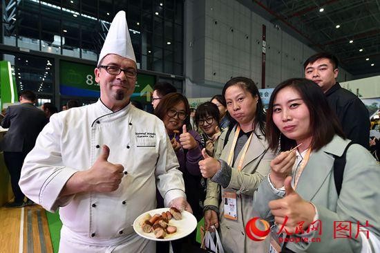Visitors hail roast sausages at the exhibition booth of the German company T?nnies Group. Photo by Weng Qiyu from People’s Daily Online