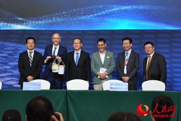McMahon signs the agreement with two cans of milk formula in his hands. The scene was applauded by the audiences. Photo by Zeng Shurou from People’s Daily Online