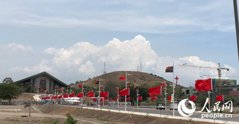 Chinese national flags are waving on PNG’s Independence Boulevard that opened to traffic in recent days. Photo by Wang Xiaodong, Liu Qing