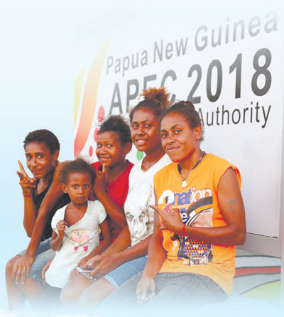 PNG citizens pose for pictures by an advertising board of APEC. Photo from Xinhua News Agency