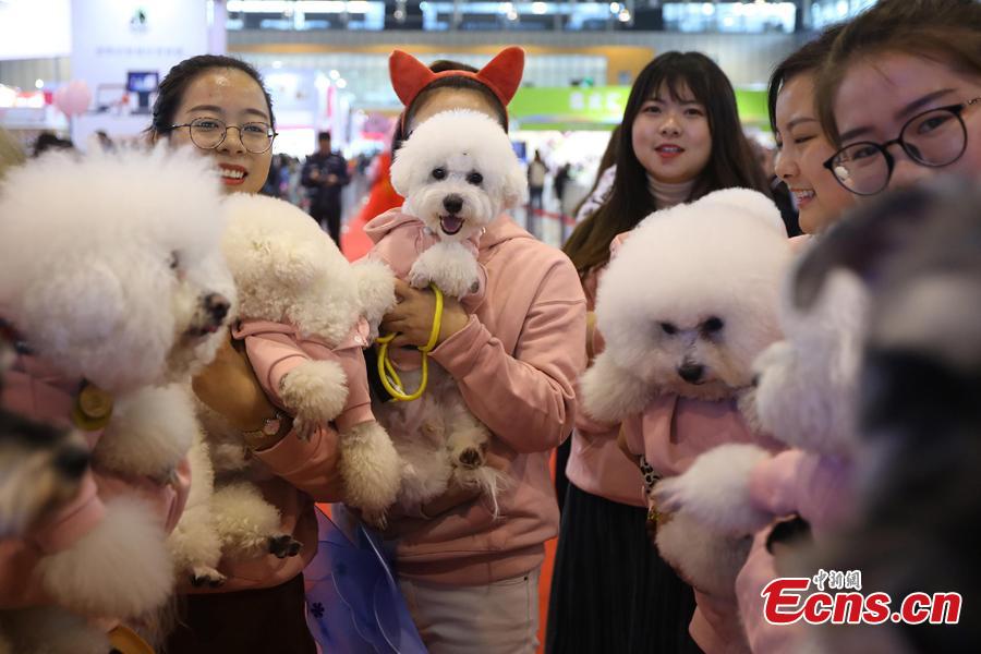 Pet dog owners pose for a photo with their dogs at the 2108 China (Nanjing) Pet Culture Festival in Nanjing, Jiangsu Province, Nov. 24, 2018. A "group wedding" was held for nearly 100 pet dogs of different breeds at the festival (Photo: China News Agency/Yang Bo)