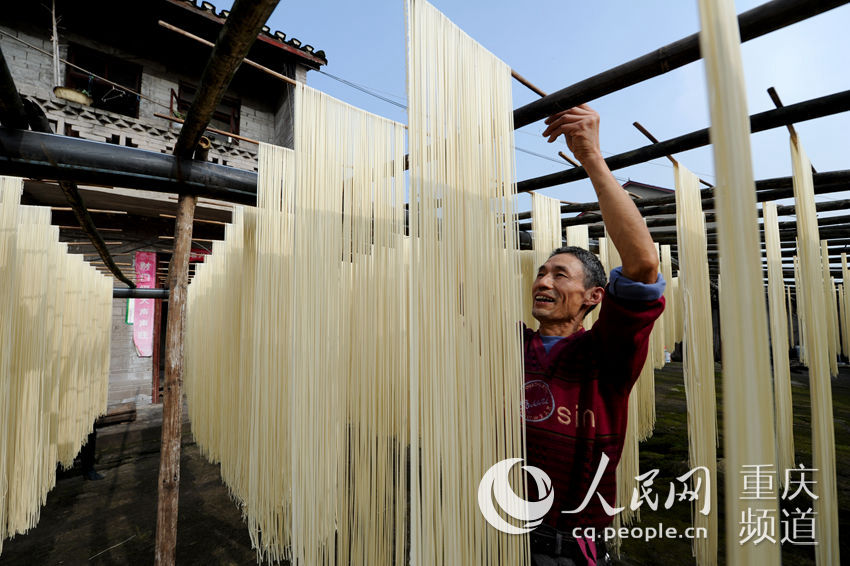 Photo taken on Nov. 25 shows Deng Kaiming’s grandson-in-law drying noodles in the kitchen courtyard. (Photo/Zhou Bangjing from People’s Daily Online)