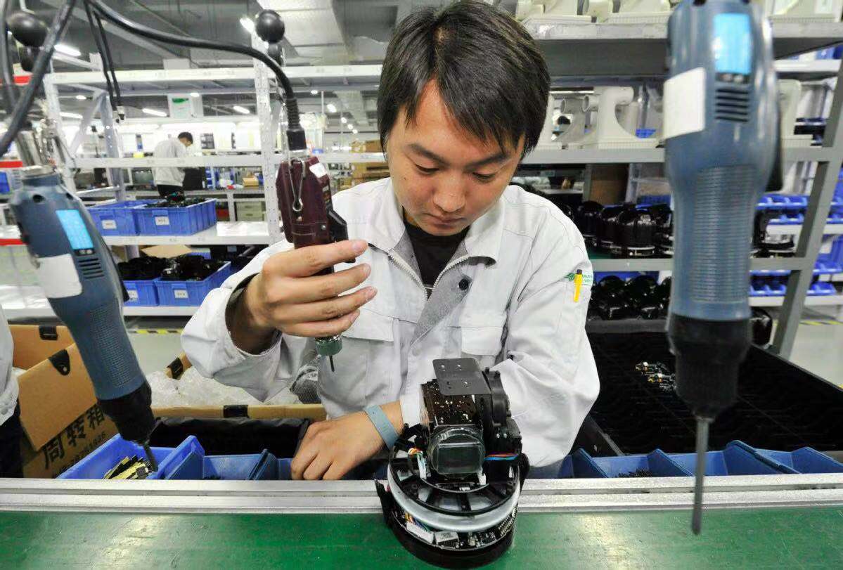 A technician adjusts a camera at a "little giant" company in Tianjin, which focuses on innovation in digital security equipment.[Photo/Xinhua]