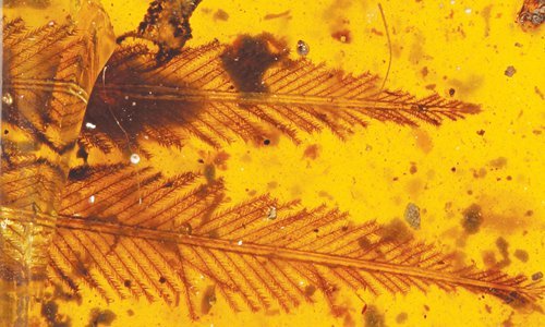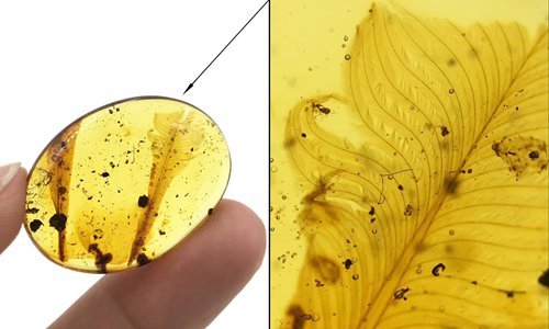 Tail feathers with strange central shafts appear in a pair in ambers formed 100 million years ago in North Myanmar. Ambers preserve the structure of feathers and provide more information than flattened fossils. [Photo: globaltimes.cn]