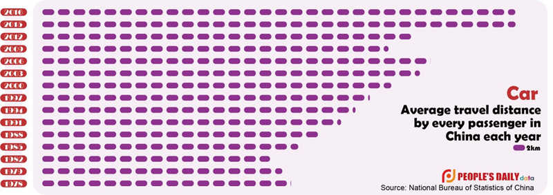 How far, on average, does everyone in China go each year? People's Daily has compared the average travel distance by each passenger in China each year from China's National Bureau of Statistics. It turns out that it is more than twice the distance compared with four decades ago.