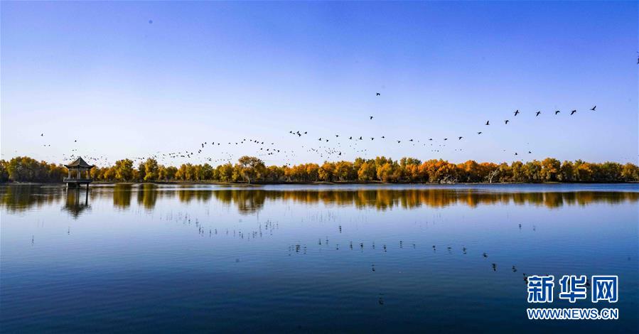 Photo taken on Oct. 25, 2018 shows birds flying over a lake in a populus euphratica forest, commonly known as desert poplar, in Luntai county, Bayingolin Mongolian Autonomous Prefecture in northwest China's Xinjiang Uygur Autonomous Region. In 2018, photographers used their equipment to capture the beauty of China throughout the four seasons all around the country. (Photo/Xinhua)