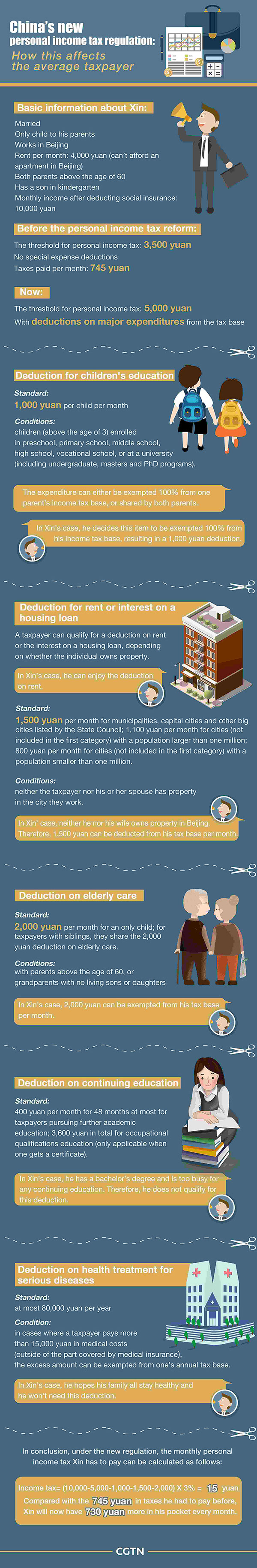 Under the new personal income law, taxpayers can claim deductions for expenses on children's education, continuing education, health treatment for serious diseases, housing loan interests, rent and elderly care. The deductible amount under each category ranges from 1,000 yuan per month to 2,000 yuan per month.