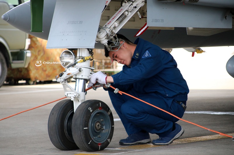 Maintenance man assigned to an aviation brigade of the air force under the PLA Northern Theater Command inspects a J-10 fighter jet prior to a recent flight training exercise. (eng.chinamil.com.cn/Photo by Xue Xiaoling)