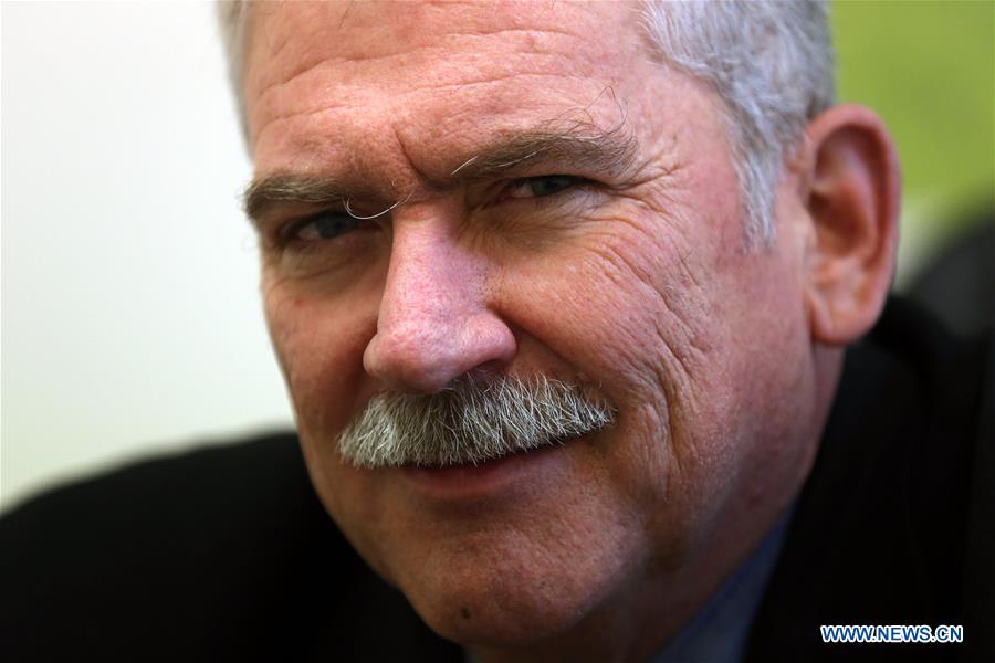 Harry Papasotiriou, a professor of international relations at Panteion University in Athens and director of the Institute of International Relations, poses for photos in Athens, Greece, Jan. 7, 2019. Harry Papasotiriou praised the efforts by the Chinese leadership to refocus the model of growth over the past five years. "It is good that China seeks a model which is less heavily dependent on exports and more on domestic demand," he said in a recent interview with Xinhua in Athens. (Xinhua/Marios Lolos)