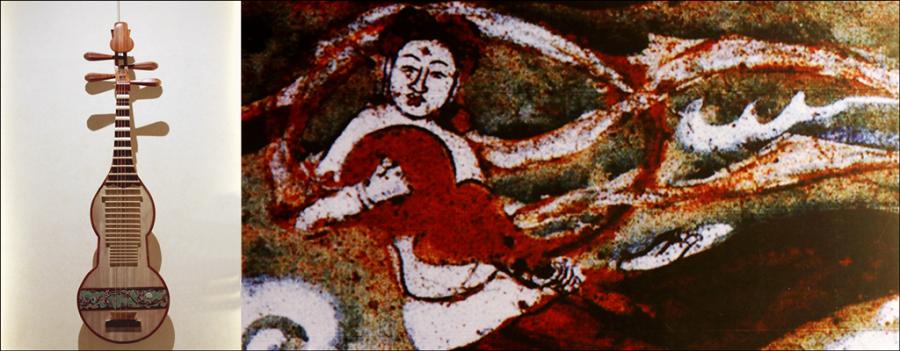 A gourd-shaped string instrument is seen in a mural in the No 322 Cave of the Mogao Grottoes. (Photo/chinadaily.com.cn)