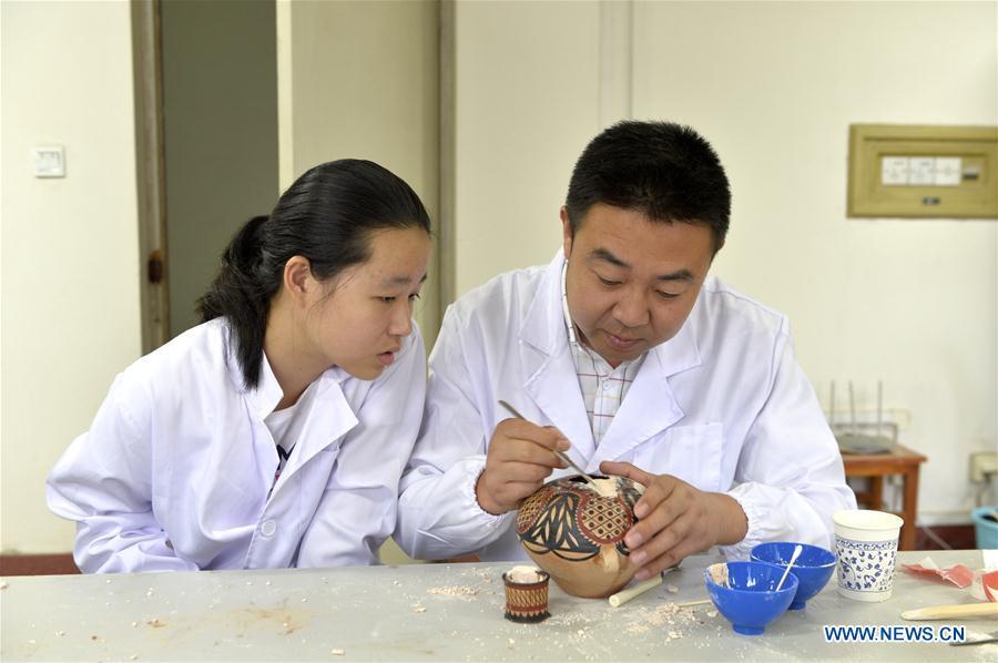 A staff member teaches a girl to repair colored pottery at Gansu Museum in Lanzhou, northwest China's Gansu Province, Aug. 16, 2018. The National Cultural Heritage Administration will work out a plan to better protect cultural relics and speed up the creation of a safety oversight platform in 2019. Stressing the importance of such protection, Liu Yuzhu, head of the administration, said lax enforcement is a prominent problem that endangers cultural relics, at a meeting attended by cultural heritage administrators nationwide. (Xinhua/Li Xiao)