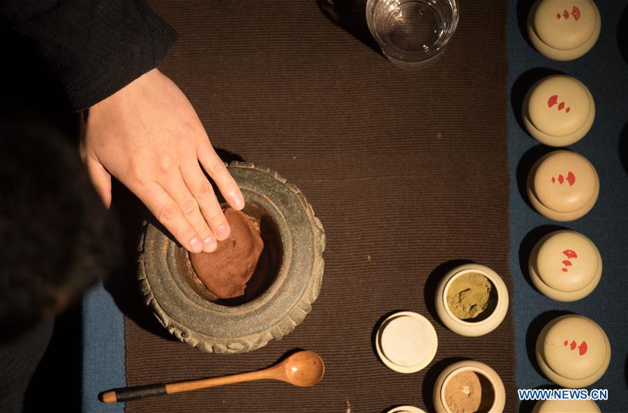 Shu Nan concocts perfumes in a traditional way to make incense in Miaoxi Town of Huzhou, east China's Zhejiang Province, Jan. 8, 2019. Being about 30 years old, Shu Nan is a famous incense maker who has made 50 kinds of incense products now. Shu Nan started to engage traditional incense making when he worked in a museum after graduation. He established his own incense studio in Hangzhou, Zhejiang's capital, in 2013. In 2018, he opened an incense culture exhibition hall in Huzhou. (Xinhua/Weng Xingyang)
