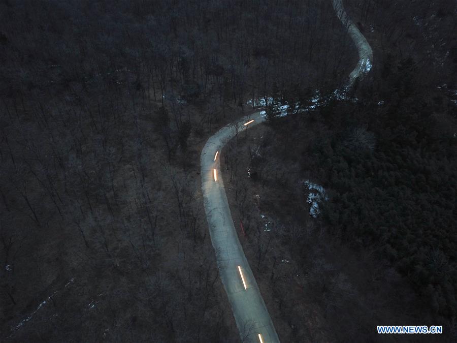Areial photo taken on Jan. 9, 2019 shows the forest rangers patrolling in the Daqing Mountain in Laixi City, east China's Shandong Province. The team of forest rangers, whose average age is above 40, have worked at Daqing Mountain provincial forest park for many years. There haven't been any wild fire accidents in Daqing Mountain for 15 years under their protection. (Xinhua/Ding Hongfa)