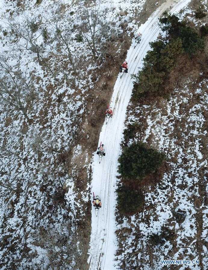 Areial photo taken on Jan. 9, 2019 shows the forest rangers patrolling in the Daqing Mountain in Laixi City, east China's Shandong Province. The team of forest rangers, whose average age is above 40, have worked at Daqing Mountain provincial forest park for many years. There haven't been any wild fire accidents in Daqing Mountain for 15 years under their protection. (Xinhua/Ding Hongfa)
